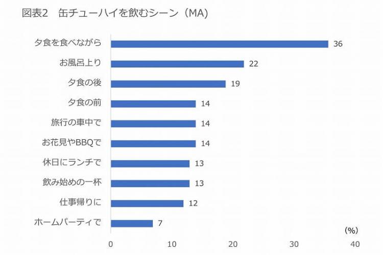 次にどのようなシーンで飲まれているのかを見ると「夕食を食べながら」が36%でもっとも多くあげられました(図表2)。2位の「お風呂上り」の22%を大きく上回っています。この2つの飲用シーンは長くビールと結びついていました。“とりあえずビール”から飲み始めて、途中で清酒や焼酎、あるいはワインに変えて食事を終えるという流れです。そしてお風呂上がりと言えばビールで、ビールの飲用シーンのシンボルでした。缶チューハイはこうした飲用シーンに徐々に入り込んで、成長してきたと推察されます。